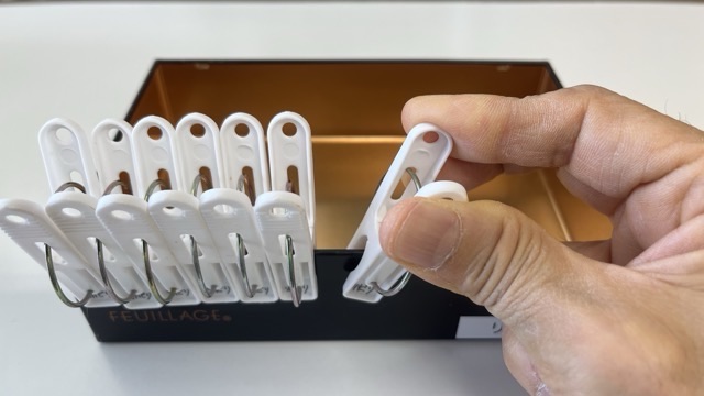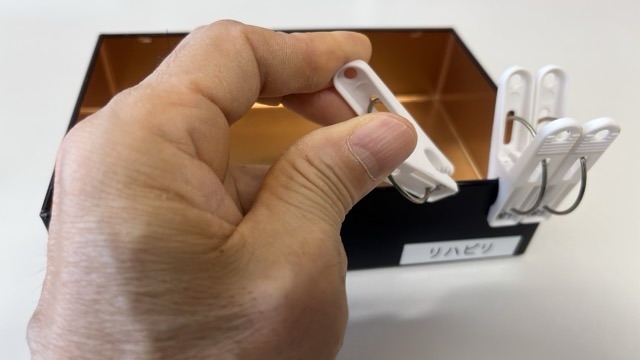 箱と洗濯バサミなんですが、まずは右手で箱に洗濯バサミを挟んでいきます。